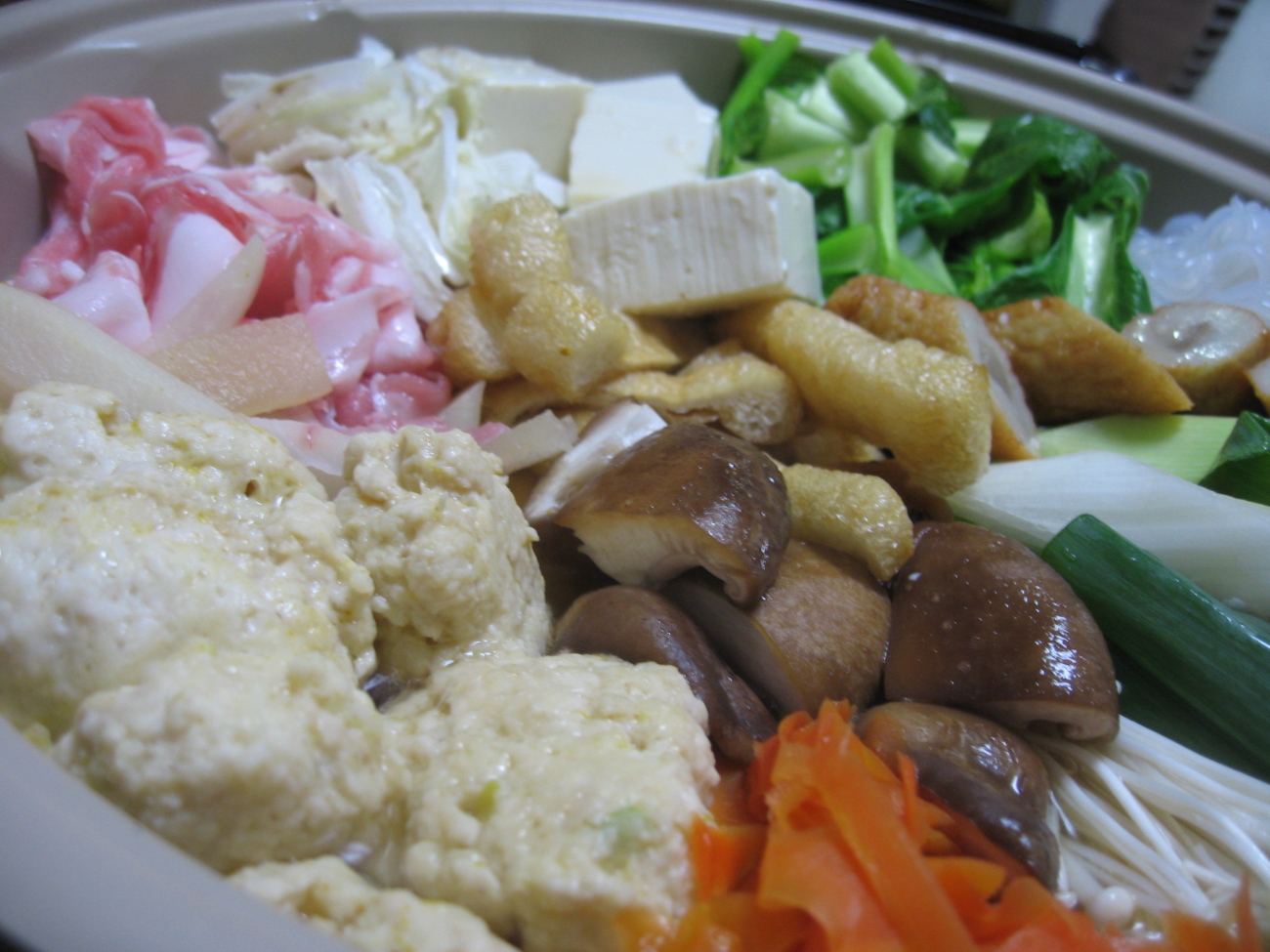 とり団子 豚バラ200G 人参1/2本 シイタケ5個 大根1/4本 豆腐1丁 ネギ②本 白菜1/4 小松菜4束 えのきだけ1袋 あぶらあげ2枚 糸こんにゃく1袋 ゴボウ天1袋